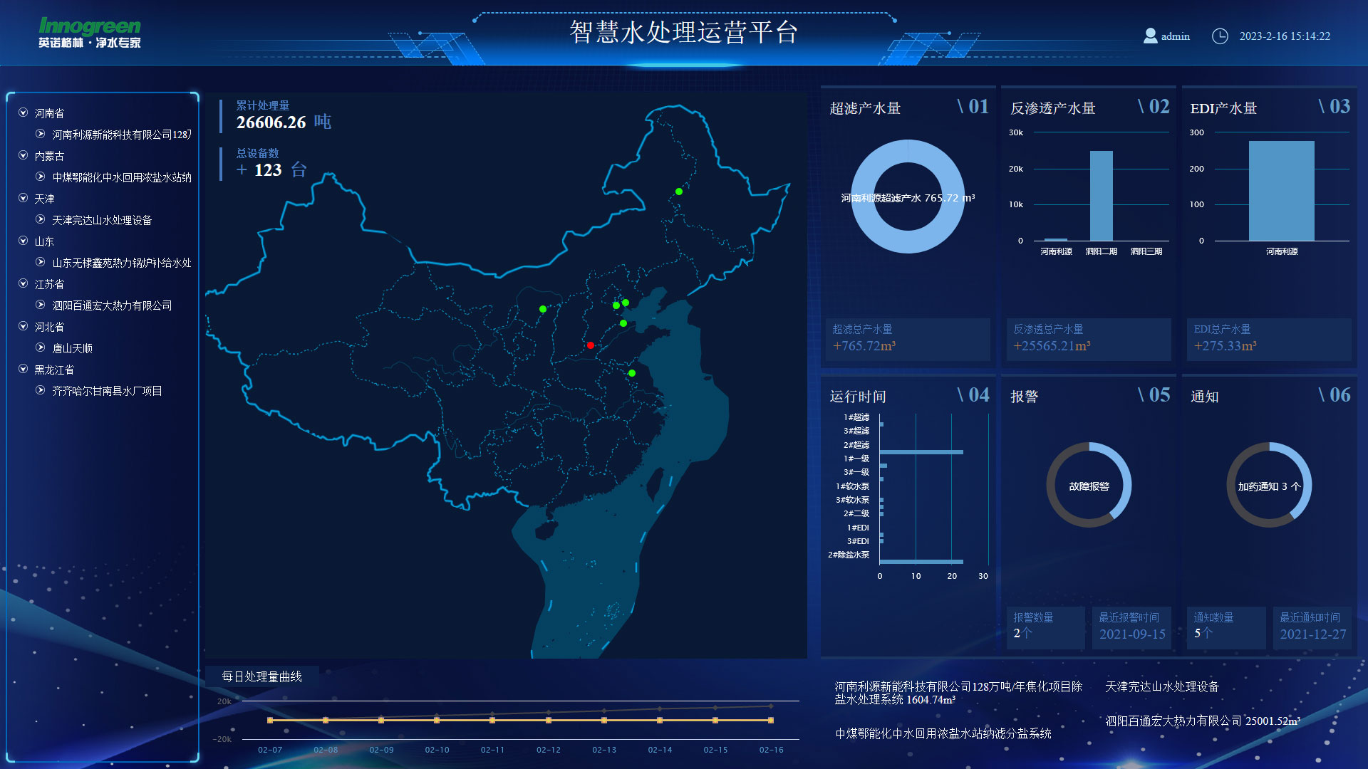 英諾格林云平臺(tái)通過(guò)物聯(lián)網(wǎng)模塊技術(shù),將全國(guó)各地接入的項(xiàng)目設(shè)備運(yùn)行數(shù)據(jù)和參數(shù)集成在云端數(shù)據(jù)中心平臺(tái),實(shí)現(xiàn)運(yùn)營(yíng)數(shù)據(jù)實(shí)時(shí)監(jiān)控、設(shè)備診斷、能耗分析、程序維護(hù)和故障報(bào)警等功能,同時(shí)集成設(shè)備的日常運(yùn)營(yíng)管理。英諾格林全國(guó)20多個(gè)滲濾液運(yùn)營(yíng)項(xiàng)目已實(shí)現(xiàn)遠(yuǎn)程在線(xiàn)監(jiān)控管理的智慧運(yùn)營(yíng),也可以為客戶(hù)設(shè)備提供遠(yuǎn)程監(jiān)控和售后管理服務(wù)。英諾格林設(shè)備云平臺(tái)的上線(xiàn),讓大型水處理設(shè)備運(yùn)營(yíng)項(xiàng)目智慧高效,運(yùn)營(yíng)成本大幅優(yōu)化。